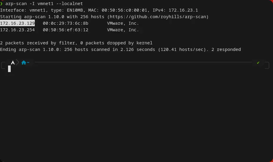 Este escaneo me identifica la máquina objetivo en “172.16.23.129” dentro de la red vmnet1.