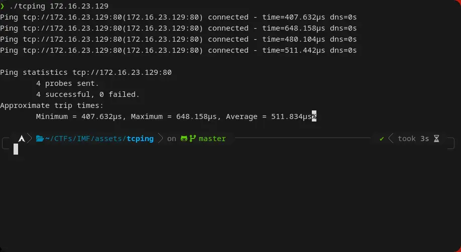 Confirmamos conexión con 172.16.23.129 por medio de la herramienta tcping.