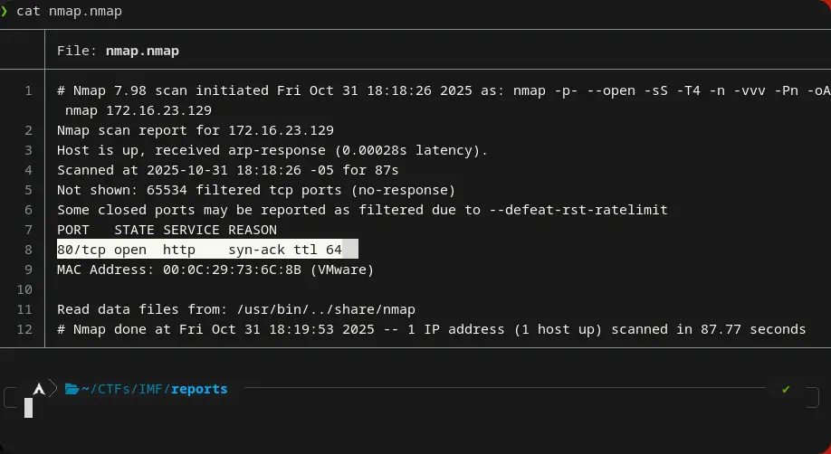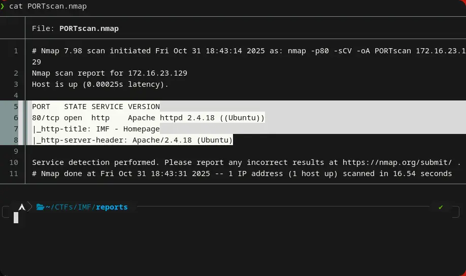 -p80: Escanea específicamente el puerto 80.-sCV: Detecta servicios (-sV) y ejecuta scripts de reconocimiento básicos (-sC).-oA PORTscan: Exporta la salida en tres formatos simultáneamente.