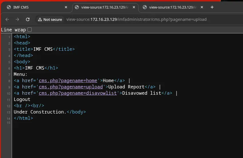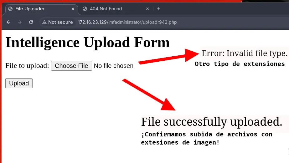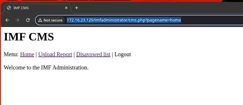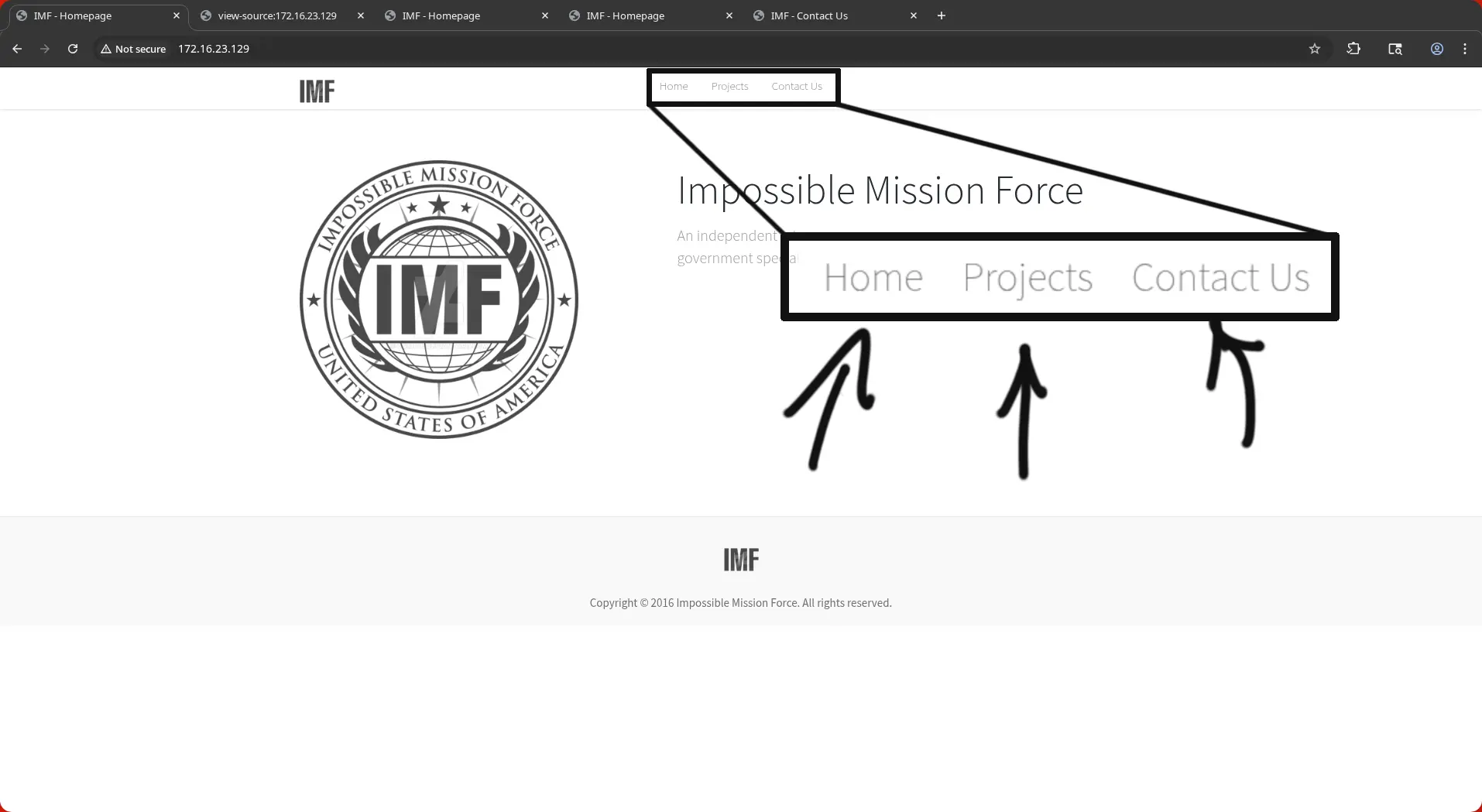 Introducimos la IP 172.16.23.129 como URL en nuestro navegador web y vemos que la misma cuenta con 3 “secciones”: