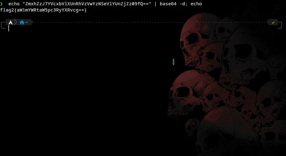 echo "ZmxhZzJ7YVcxbVlXUnRhVzVwYzNSeVlYUnZjZz09fQ==" | base64 -d; echo