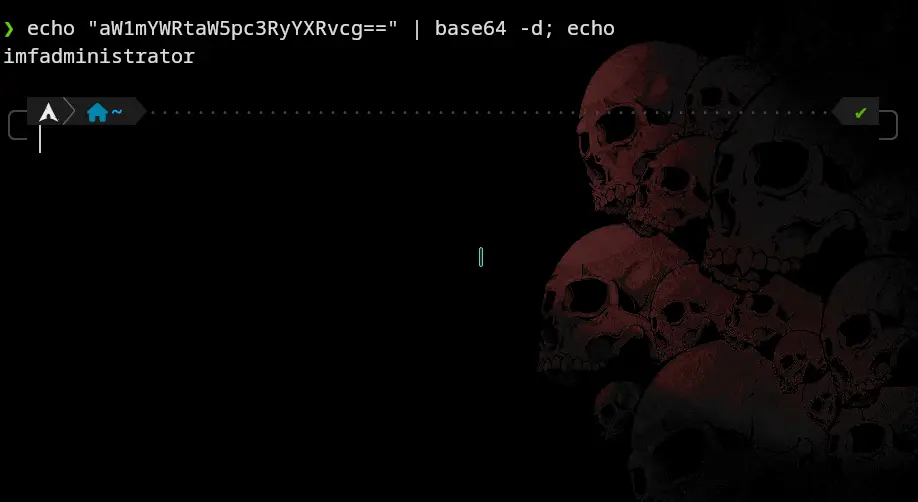 echo "aW1mYWRtaW5pc3RyYXRvcg==" | base64 -d; echo