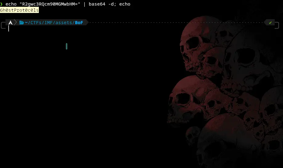 echo "R2gwc3RQcm90MGMwbHM=" | base64 -d; echo