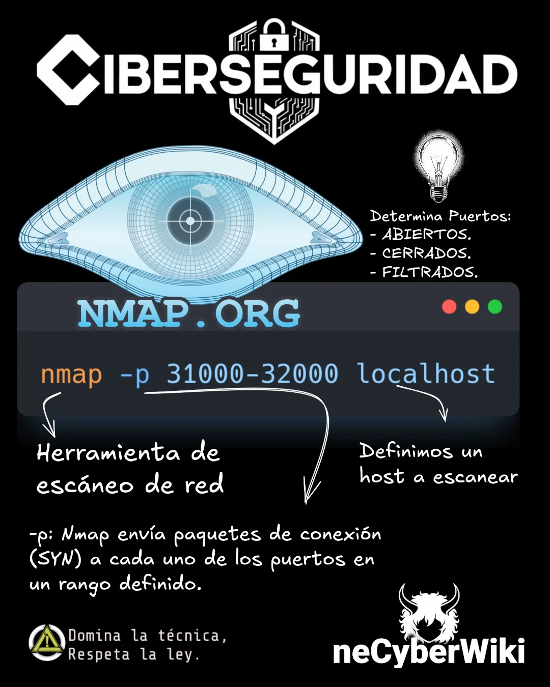 -p [puertos]: Selecciona puertos específicos (ej:-p 80,443o-p 30001-32000).localhost: Se usa para escanear el propio sistema local.