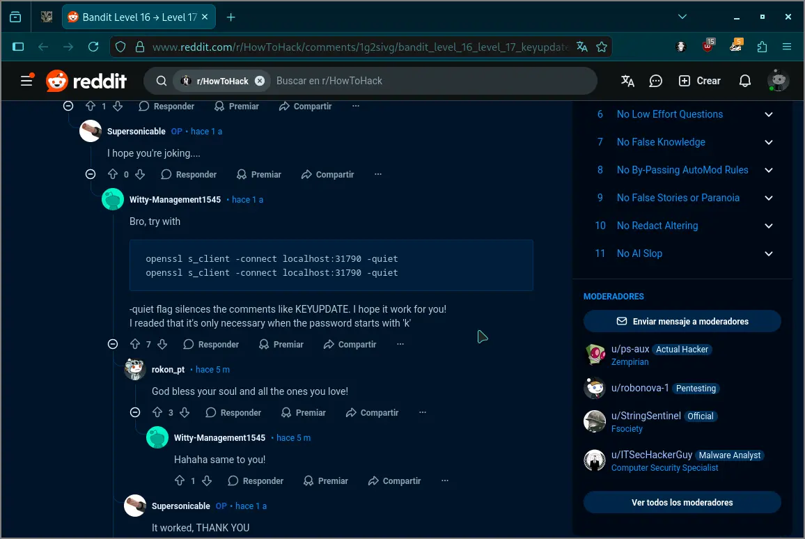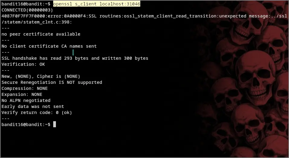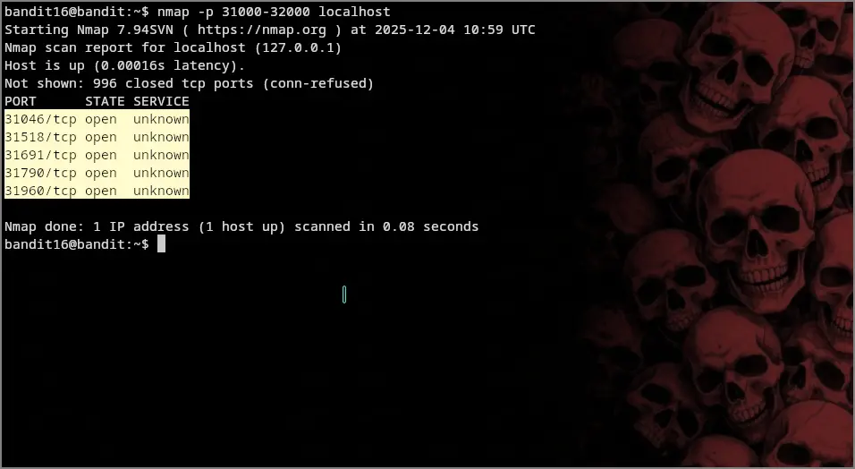 El desafío en este nivel consiste en encontrar un servicio cifrado (SSL/TLS) que escucha en un puerto dentro del amplio rango 31000 a 32000 en localhost. El objetivo es conectarnos al puerto correcto y enviarle la contraseña de Bandit16 para que nos devuelva la contraseña del siguiente nivel.
