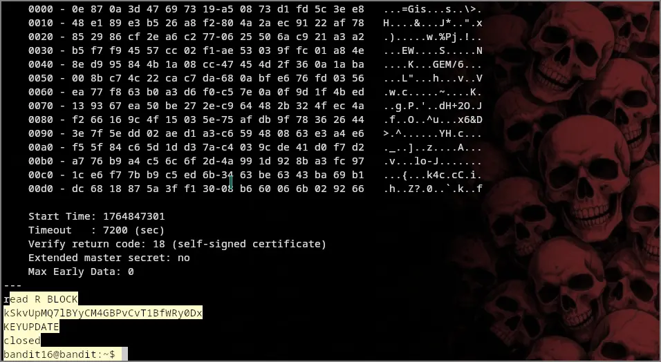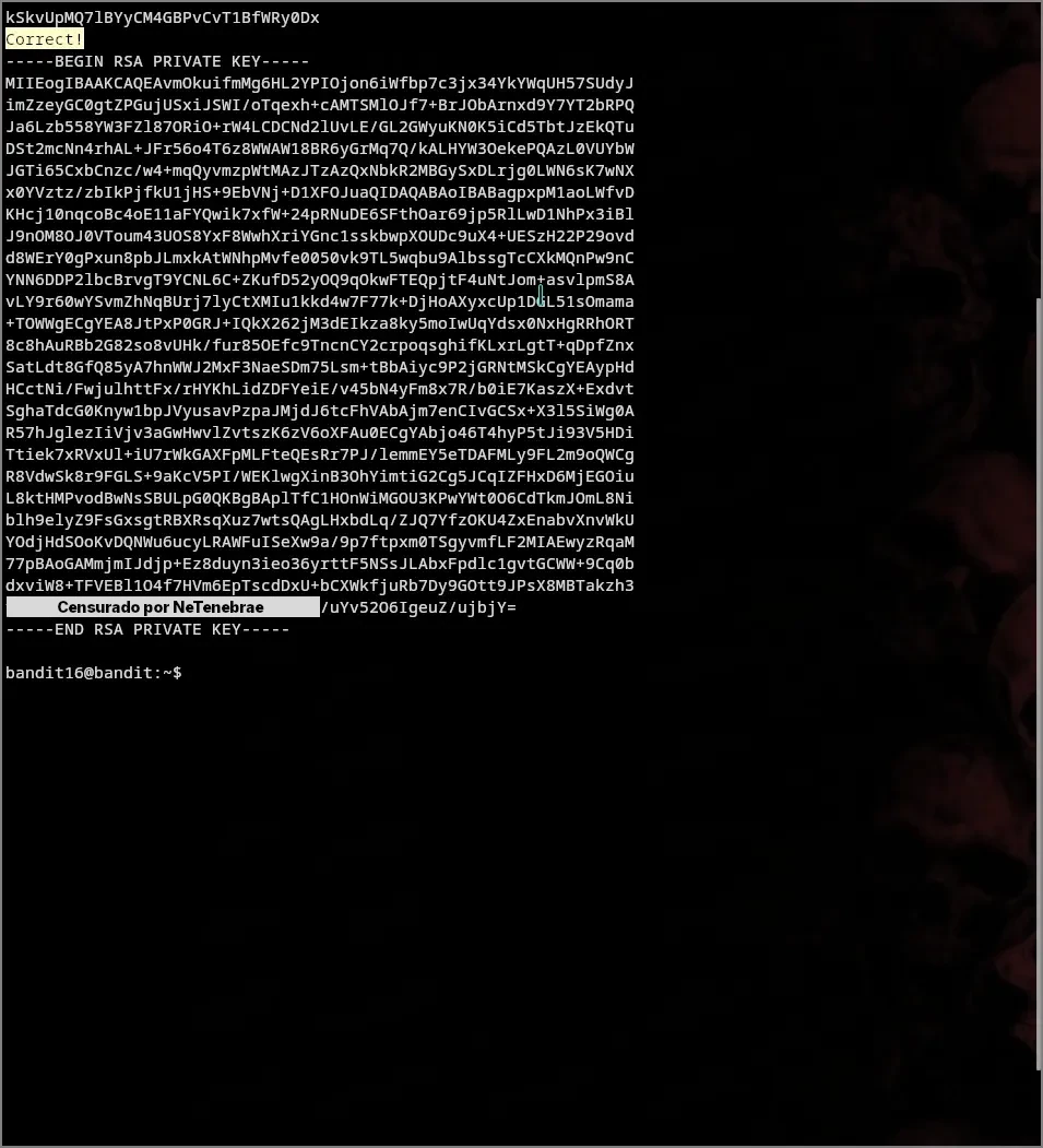 # Ingresar la contraseña de Bandit16 aquí¡Boom! Al enviar la contraseña de Bandit16, el servicio responde con la llave privada SSH, que es la contraseña de Bandit17.