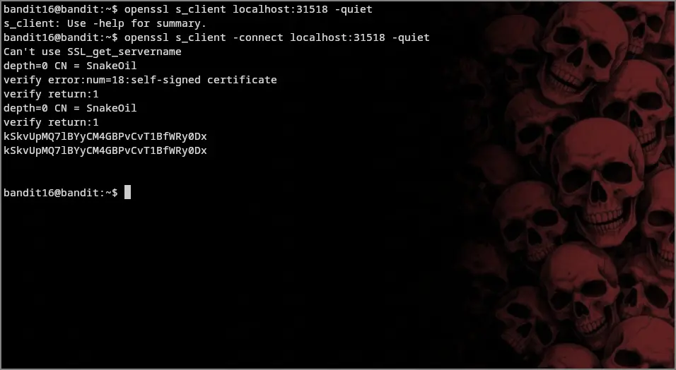-ign_eof(Ignore End Of File): Por defecto,openssl s_clienten modo interactivo sale de la conexión cuando encuentra el fin de archivo (EOF) en su entrada (lo que sucede inmediatamente al usarechoocata través de un pipe). Esta opción inhibe el cierre de la conexión cuando se alcanza el EOF en la entrada. Esto permite que el cliente permanezca conectado y que la contraseña, enviada a través deecho <PASSWORD> |, sea procesada por el servidor, el cual luego envía la clave del Nivel 17.